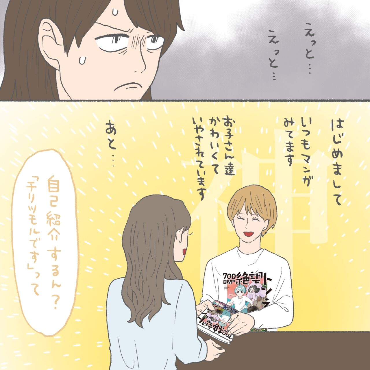 サイン会に行く 3 2022/05/26 ようこそチリツモブログへ初めましての方はまずコチラからどうぞ はじめに 前回のおはなし↓ 4月にまりげさんのサイン会に行ってきました🕺🏻テンパって早々に自己紹介まじでセリフぶっ飛んだあいたたたーつづく 次のおはなし その他の日常漫画 ↓LINEスタンプ販売中↓ 公式LINEで更新通知を受け取る↓話しかけるとイラストが出たり(現在170枚ほど登録済み) 私から更新通知と絵が勝手に送られてきます! 連載 SNS 書籍 「日常漫画」カテゴリの最新記事 < 前の記事次の記事 >